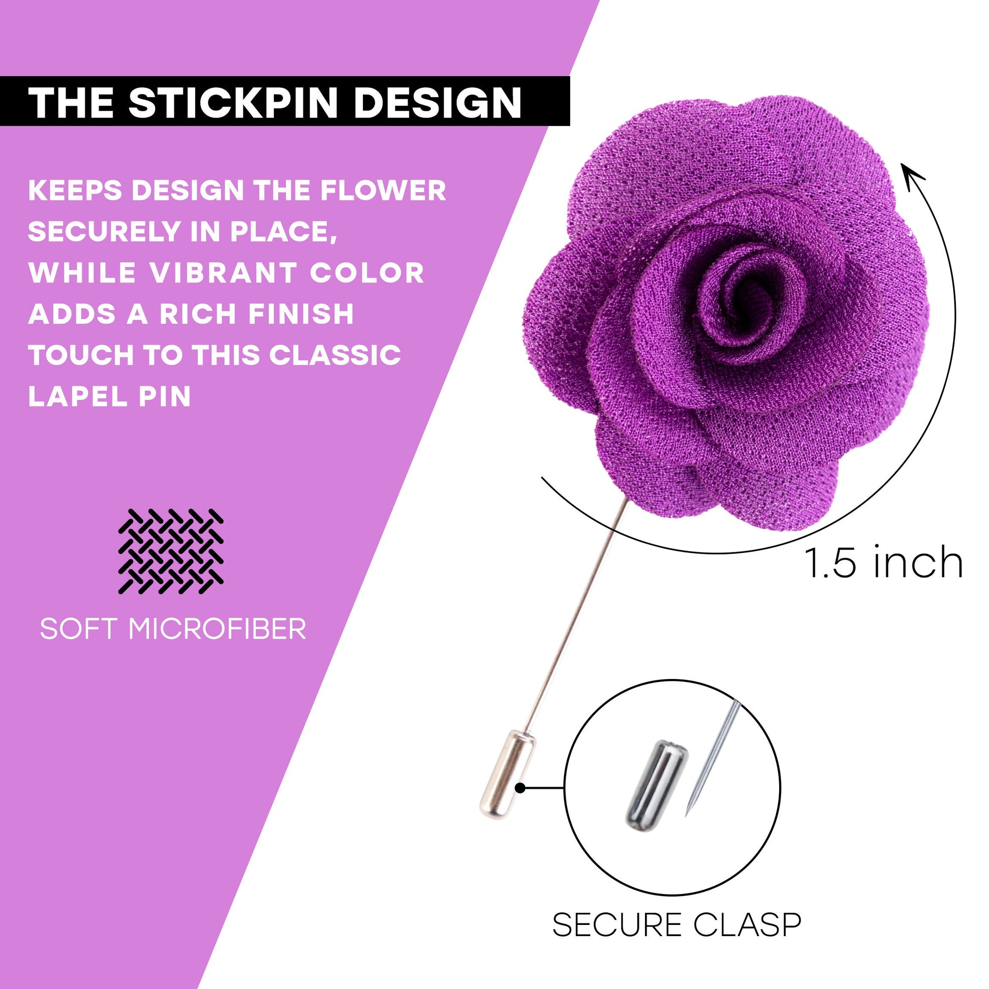 The stickpin design keeps the flower in securely in place, while the vibrant purple color adds a rich finishing touch to this classic lapel pin. Wear it to a wedding, business meeting or formal event for the perfect way to accessorize your ensemble.